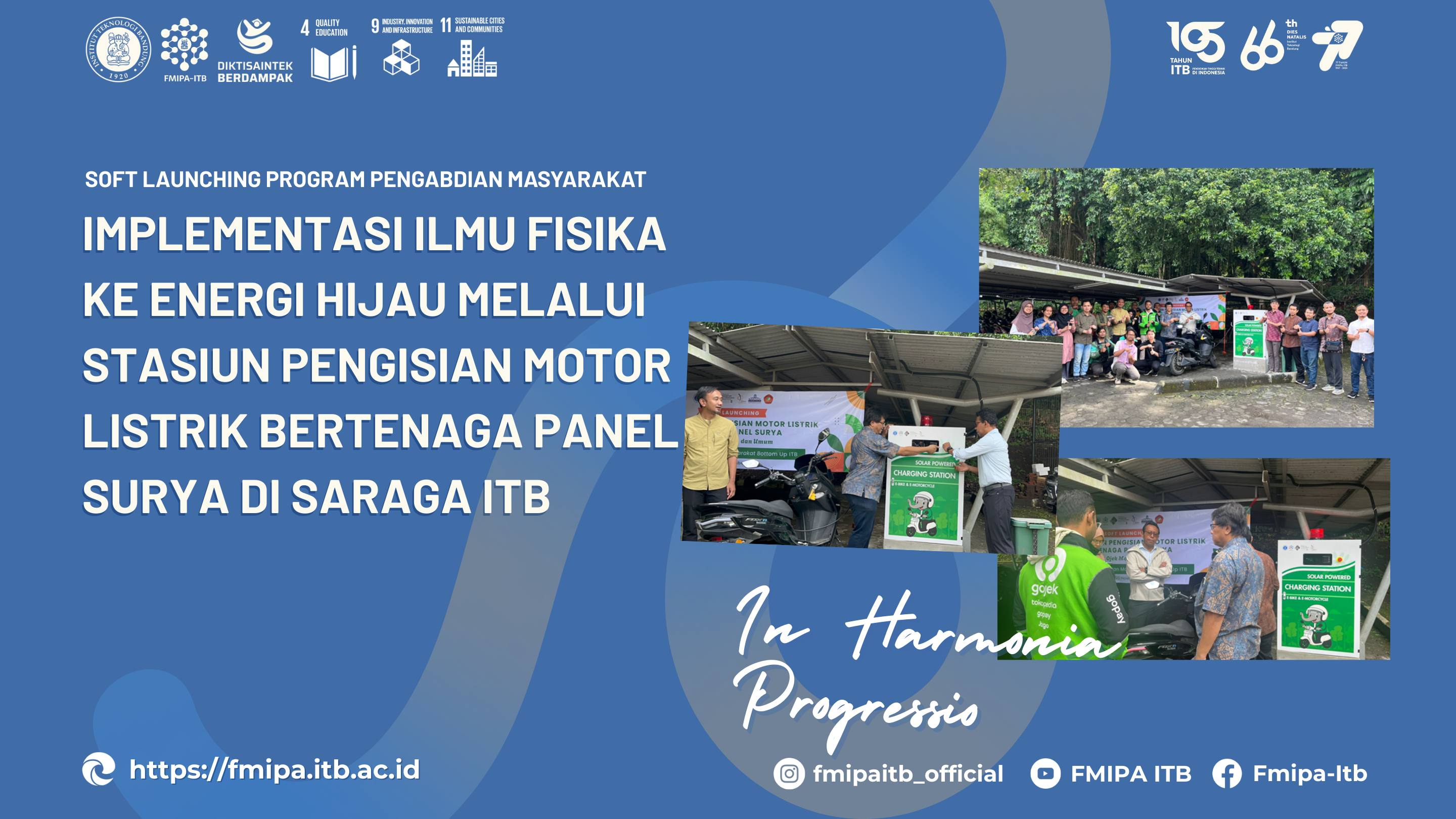 BANDUNG, fmipa.itb.ac.id, -Pada hari Rabu, 20 November 2025, telah diresmikan sebuah Stasiun Pengisian Motor Listrik Bertenaga Panel Surya (SPML-PS) di area Sarana Olahraga Ganesa (Saraga). Program ini merupakan bentuk pengabdian masyarakat hasil kerjasama KK Fisika Fotonik dan Magnetik (FMF), KK Fisika Instrumentasi dan Komputasi (FIK), Politeknik Negeri Padang (PNP) dan Saraga ITB. Soft launching program ini […]